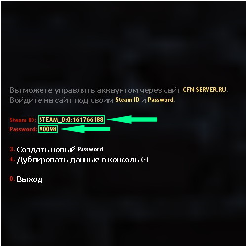 3. В открывшемся меню вы увидите данные для входа на сайт: Steam ID и Password.