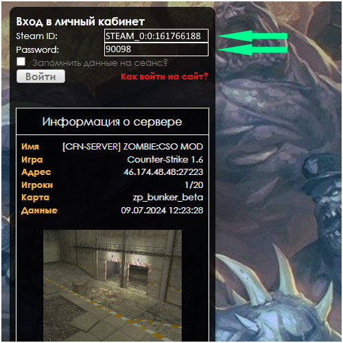 1. Для входа на сайт вам необходимо зайти на сервер NEXON zombie SERVER CS:ONLINE и открыть главное меню игры на кнопку М.
